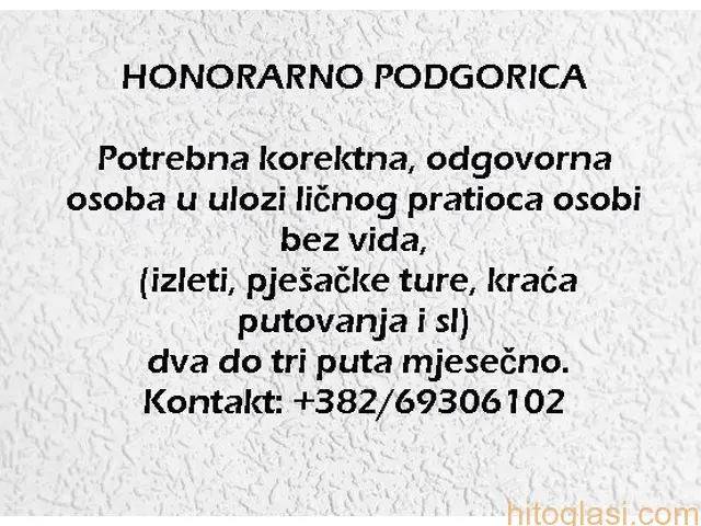 Potrebna korektna, odgovorna osoba u ulozi ličnog pratioca osobi bez vida, (izleti, pješačke ture, kraća putovanja i sl), dva do tri puta mjesečno.Kontakt: +38269306102