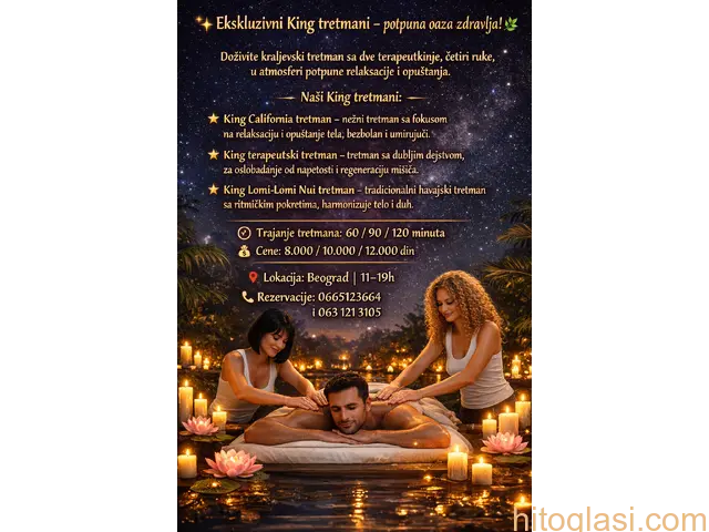 King kraljevska masaža ✨ Ekskluzivni King tretmani – potpuna oaza zdravlja! 🌿 Doživite kraljevski tretman sa dve terapeutkinje, četiri ruke, u atmosferi potpune relaksacije i opuštanja. Naši King tretmani: King California tretman – nežni tretman sa fokusom na relaksaciju i opuštanje tela, bezbolan i umirujući. King terapeutski tretman – tretman sa dubljim dejstvom, za oslobađanje od napetosti i regeneraciju mišića. King Lomi-Lomi Nui tretman – tradicionalni havajski tretman sa ritmičkim pokretima, harmonizuje telo i duh. ⏱ Trajanje tretmana: 60 / 90 / 120 minuta 💰 Cene: 8.000 / 10.000 / 12.000 din 📍 Lokacija: Beograd | 11–19h 📞 Rezervacije:0665123664 i 063 121 310...
